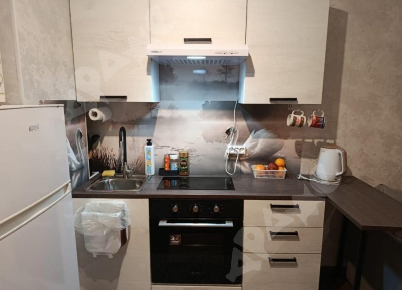 В студии есть все необходимое для комфортного проживания: кухонный гарнитур с варочной поверхностью, холодильник, стиральная машина, диван, стол и стулья.