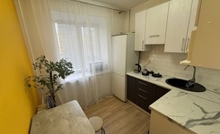 Мебель: кухонный гарнитур, диван раскладной, стулья, кровать с ортопедическим матрасом 160*200, 2 больших шкафа, плотные шторы, комод, зеркало.