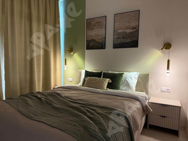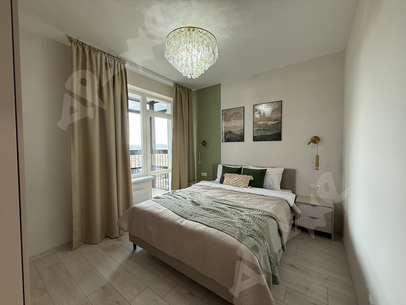 Квартира на 24- м этаже с панорамным видом, квартира оборудована отдельной гардеробной комнатой, кухня с посудомойкой, большой холодильник, микроволновка, чайник, кровать с подъемным механизмом для хранения вещей, шкаф, комод.