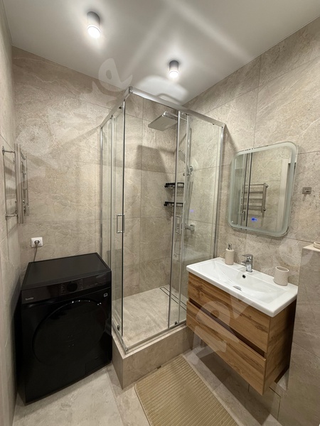 Санузел совмещенный. Оснащен душевой кабиной, широкой раковиной, встроенным шкафом и стирально-сушильной машиной.