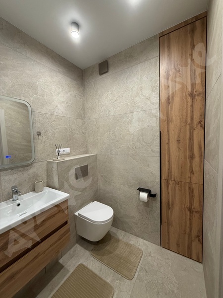 В сан. узле теплый пол, новая сантехника, стиральная машина, большая тумба под раковиной и шкаф над инсталляцией для удобства хранения вещей.