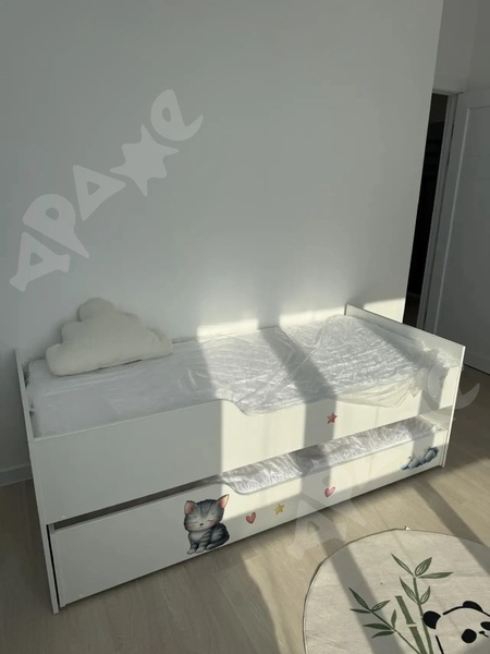 В спальне новая кровать и матрас, шкаф и 2 комода.