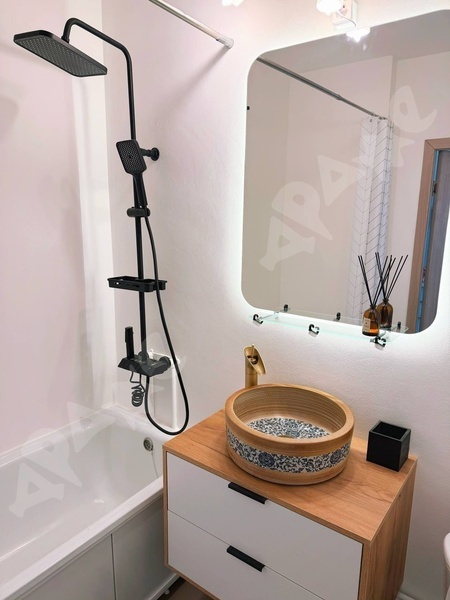 В сан. узле теплый пол, новая сантехника, стиральная машина, большая тумба под раковиной и шкаф над инсталляцией для удобства хранения вещей.