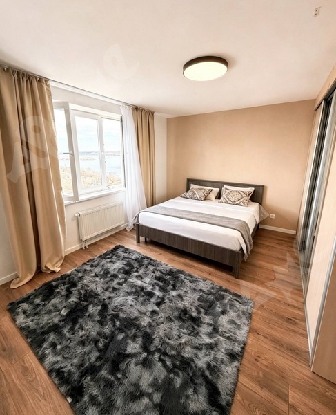Квартира на 24- м этаже с панорамным видом, квартира оборудована отдельной гардеробной комнатой, кухня с посудомойкой, большой холодильник, микроволновка, чайник, кровать с подъемным механизмом для хранения вещей, шкаф, комод.