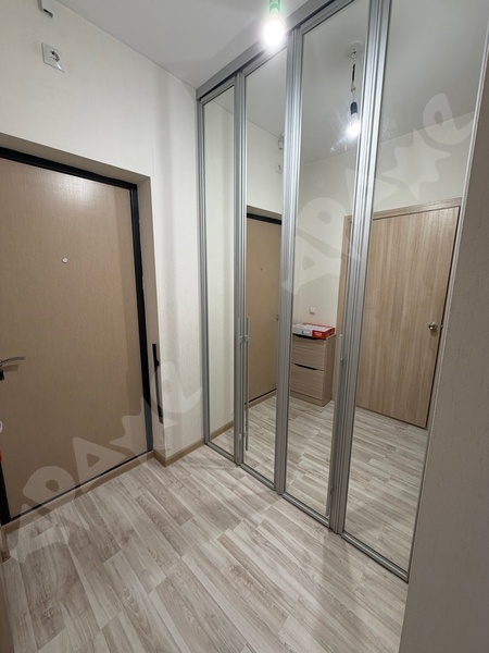 За счет перегородки студия становится компактной однокомнатной квартирой с изолированной комнатой для отдыха и кухней , в прихожей имеется вместительная встроенная гардеробная с большими зеркалами