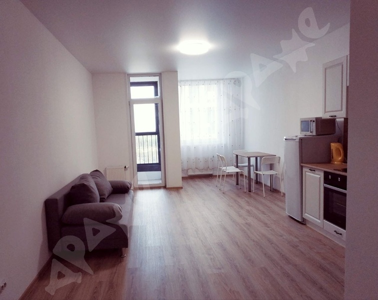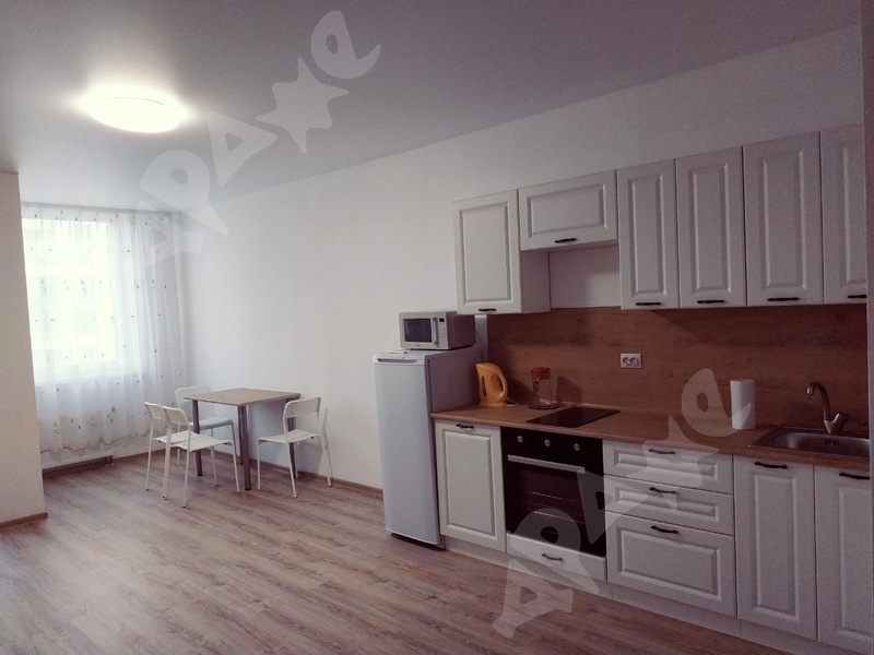 Сдается студия, дом новый, мебель диван, стол, стулья, шкаф, кухня.