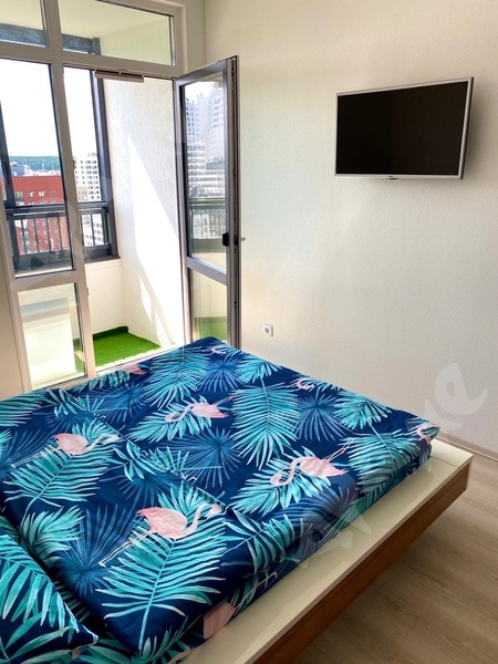 Площадь квартиры 28,6 кв м, этаж 14. Дому меньше года. Смежный санузел, балкон. Есть кровать, кухонный гарнитур, техника.
