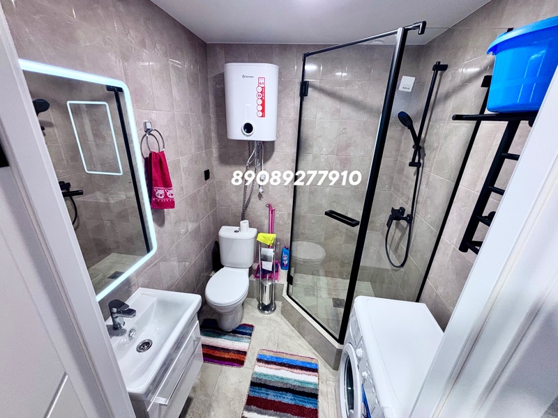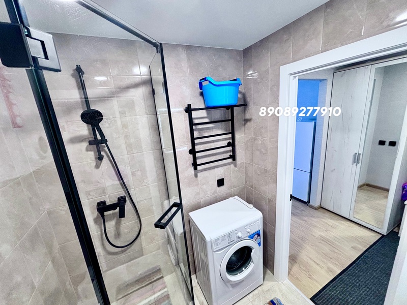 - Современная душевая кабина, раковина с зеркалом (скрытое хранение и подсветка).