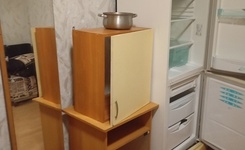 Есть холодильник, диван, стиральная, машина, микроволновка, шкаф.