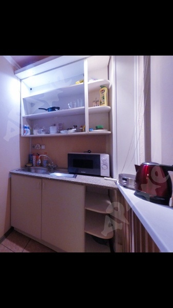 В студии есть все необходимое для комфортного проживания: кухонный гарнитур, маленький холодильник, стиральная машина, кровать, стол, микроволновка, чайник, электрическая плитка.