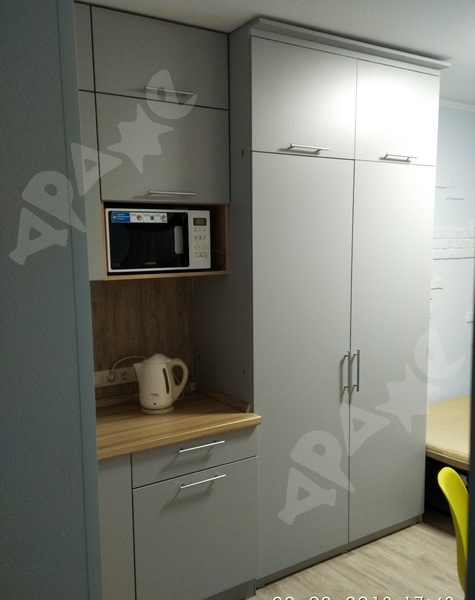Мебель: кровать с местом хранения, шкаф с зеркалом, кухонный гарнитур, стул со столом, прихожая, вообщем-то все что есть на фото.