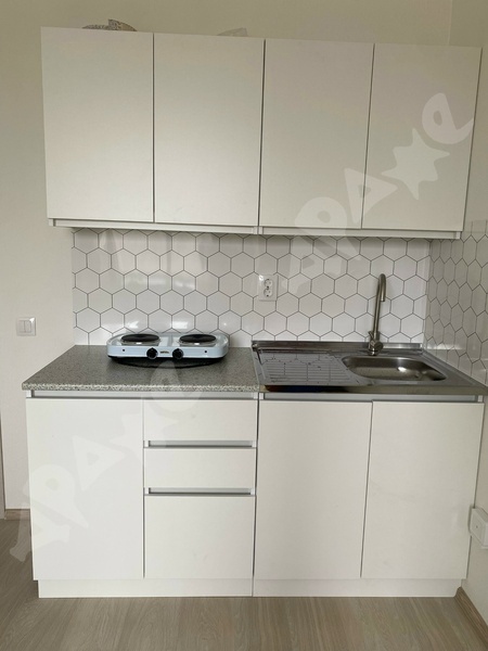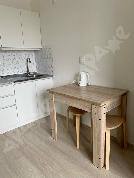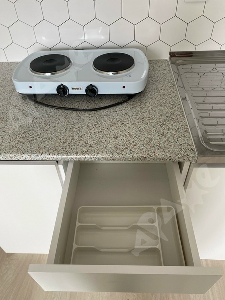 В студии есть все необходимое для комфортного проживания: кухонный гарнитур с варочной поверхностью, холодильник, стиральная машина, диван, стол и стулья.