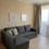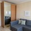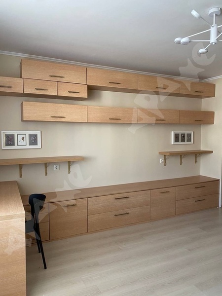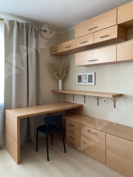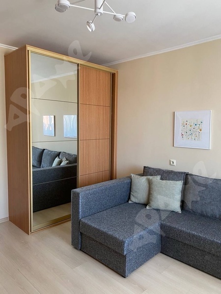Просторная гостиная с новым диваном, рабочим местом, шкафом. Без телевизора.