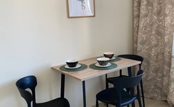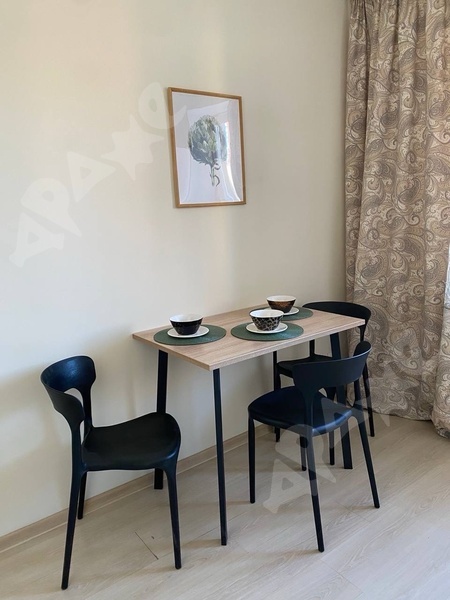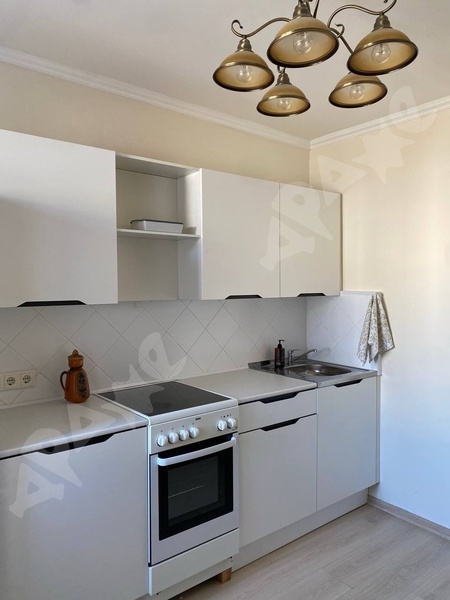Кухня 11 кв.м. с новой мебелью (кухонный гарнитур, стол, стулья), укомплектована электрической плитой (варочная поверхность, духовка), xолодильником, чайником.