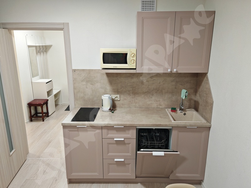 Техника: холодильник, варочная панель, посудомоечная и стиральная машины, чайник, микроволновка.