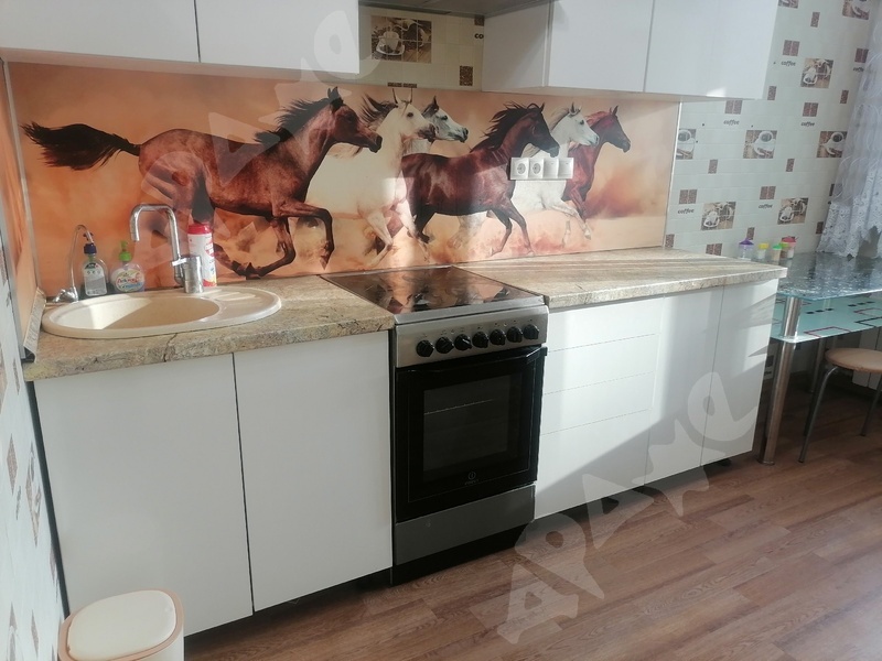 Кухня: тюль, холодильник(с морозильной камерой внизу), варочная панель, чайник, стиральная машина, кухонный гарнитур, стол и стулья (4 шт), стульчик для кормления.
