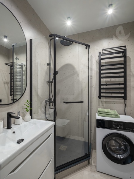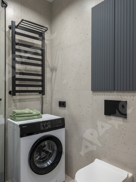 В сан. узле теплый пол, новая сантехника, стиральная машина, большая тумба под раковиной и шкаф над инсталляцией для удобства хранения вещей.