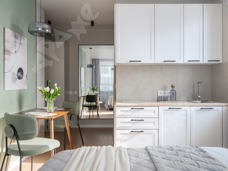 В студии есть все необходимое для комфортного проживания: кухонный гарнитур с варочной поверхностью, холодильник, стиральная машина, диван, стол и стулья.