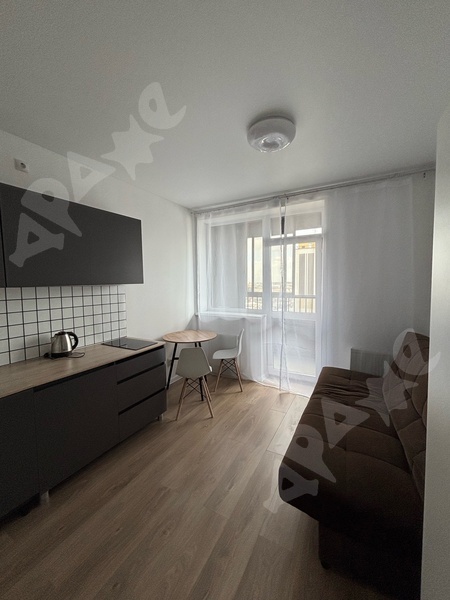 В студии есть все необходимое для комфортного проживания: кухонный гарнитур с варочной поверхностью, холодильник, стиральная машина, диван, стол и стулья.