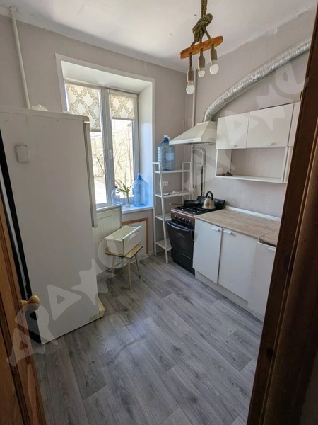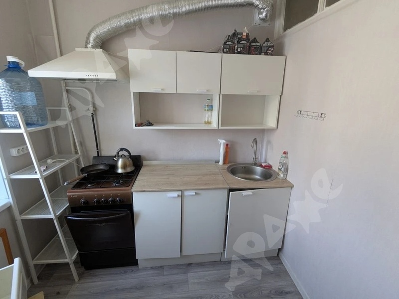 В квартире имеется мебель - кухонный гарнитур, вытяжка, стол, стулья;
