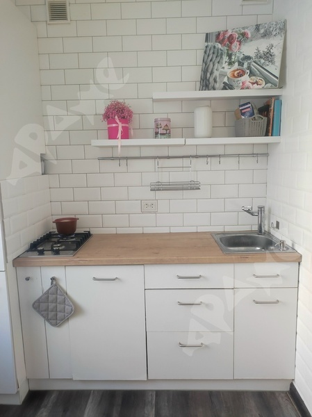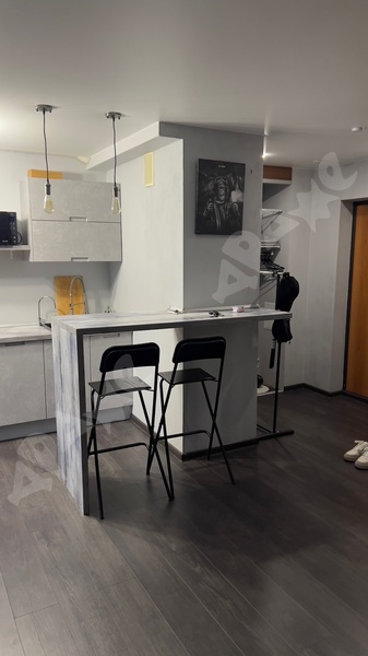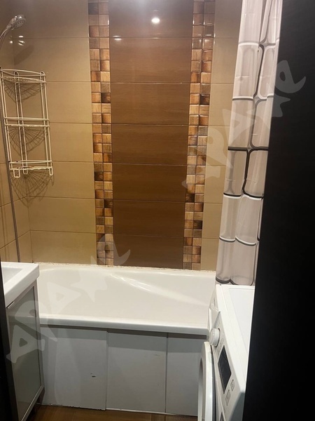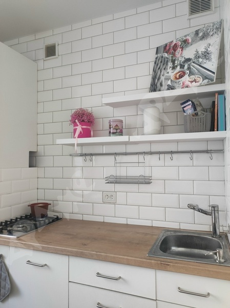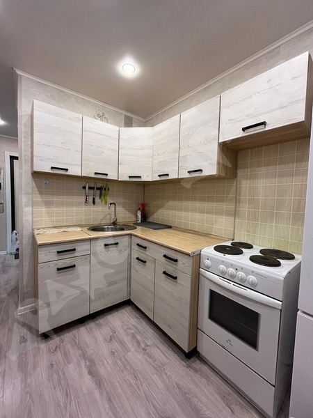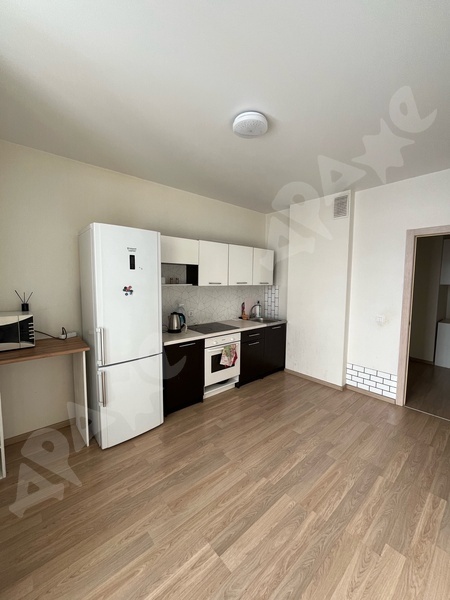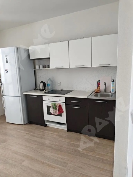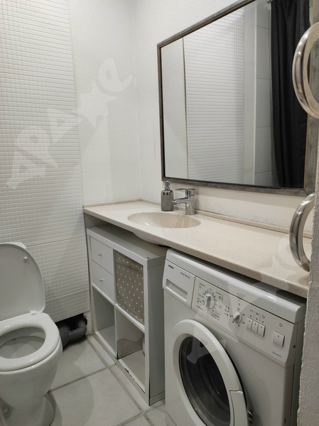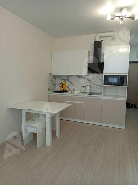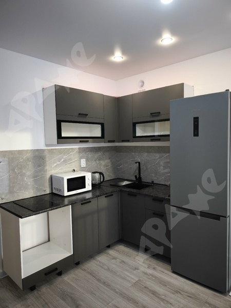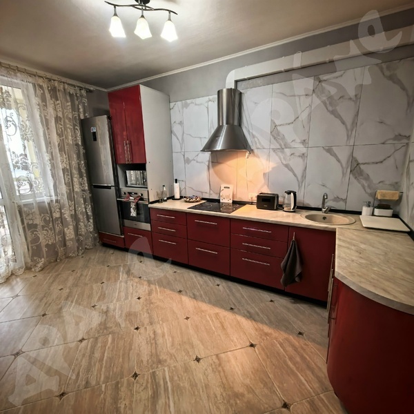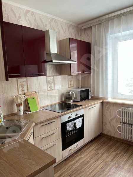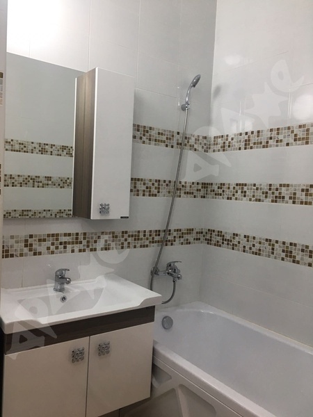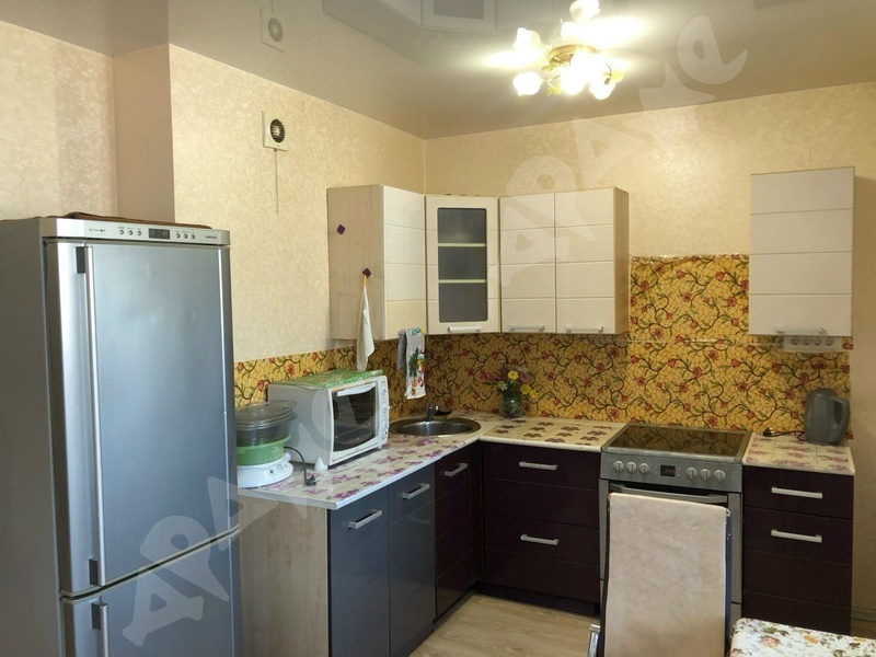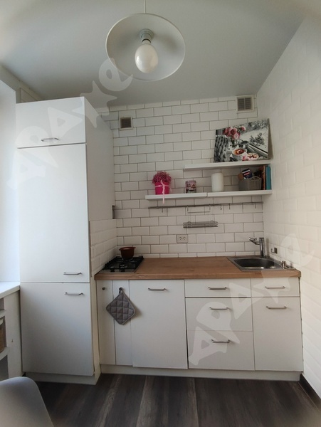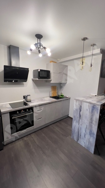 В квартире сделан качественный ремонт, санузел в плитке, кухонный гарнитур с раковиной и варочной поверхность, стиральная машина, пенал в ванной, холодильник, микроволновка, диван, шкаф, кухонный стол, кухонные стулья.