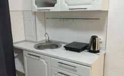 - Полноценная кухонная зона (плита, холодильник, чайник, посуда)