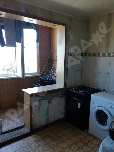Квартира на 5 этаже, из мебели есть диван, кух. гарнитур, стул, стол, стиральная машина, плита.