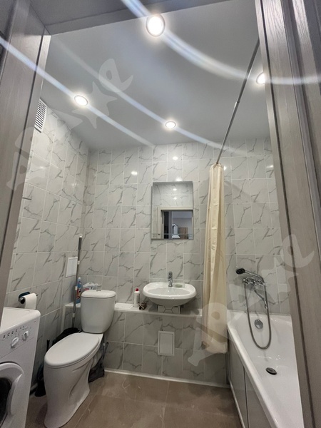 Квартира на 15-м этаже, из мебели есть прихожая, кухонный гарнитур, холодильник, кухонный стол, стулья, диван. Совмещенный санузел, стиральная машина. Балкон. Всё как на фото.