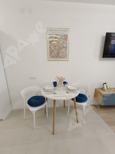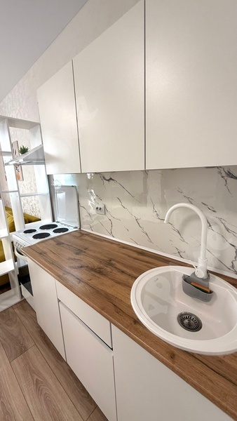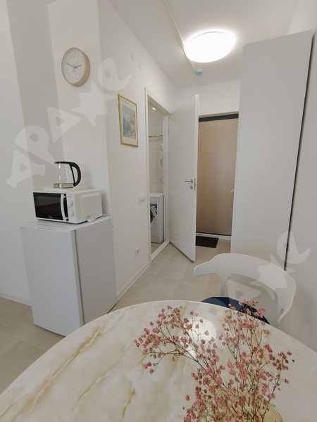 Новая мебель и бытовые электроприборы: индукционная плита, холодильник, микроволновка, чайник, стиральная машина на 5 кг., фен. Двухспалтный диван с матрасом на независимых пружинах. Имеется гостевой диванчик (раскладной)и вместительный шкаф.