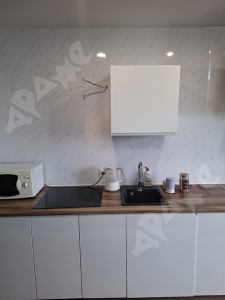 Квартира на 5-м этаже. Из мебели есть диван, стол, кухонный гарнитур. Из техники всё необходимое: чайник, микроволновка, плита, стиральная машина