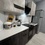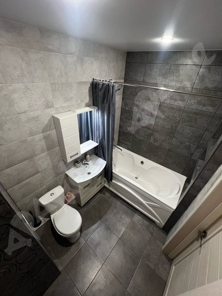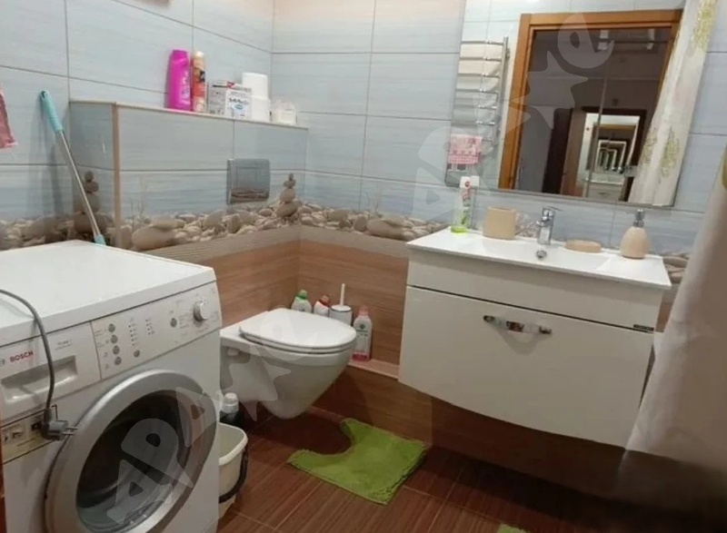 - Современная душевая кабина, раковина с зеркалом (скрытое хранение и подсветка).