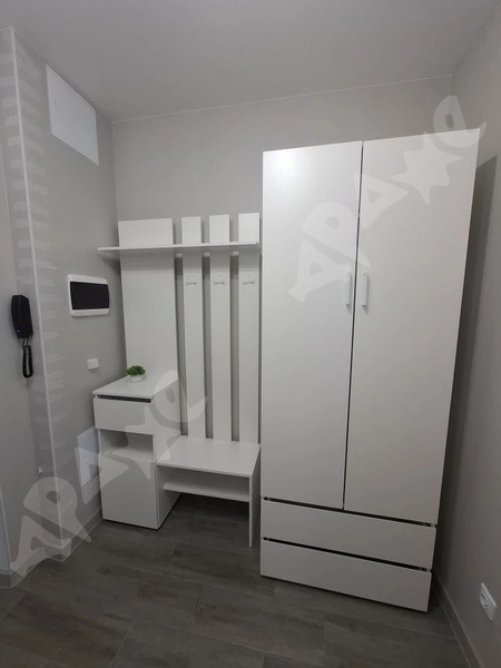 Одна двуспальная кровать. В коридоре большой шкаф. Всё новое.