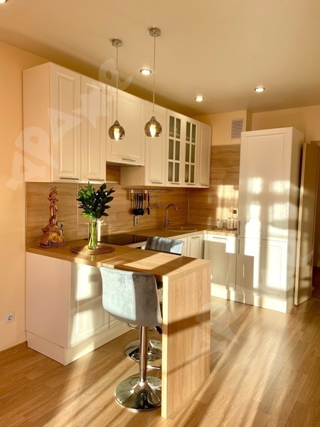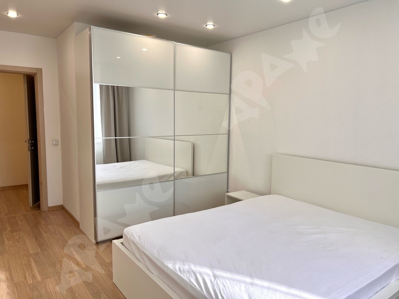 Большая просторная кухня-гостиная с белой матовой кухней, светлая уютная спальня с двухместной кроватью, 2-метровый шкаф купе с зеркалами.