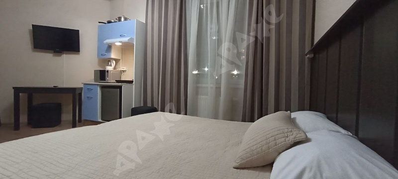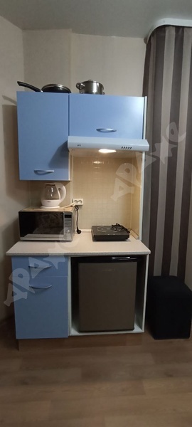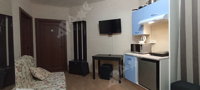 - Кухня-гостиная:Холодильник, посудомоечная машина, электрическая варочная панель, вытяжка, микроволновая печь, чайник, стол кухонный, стулья - 2 шт, большой удобный диван, так же имеется гладильная доска, утюг и сушилка для белья.