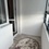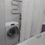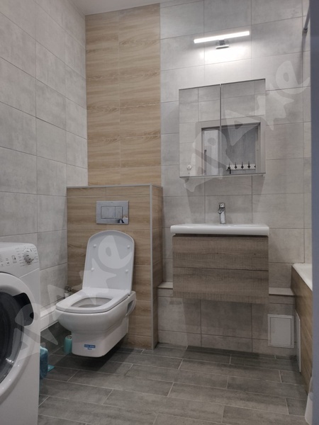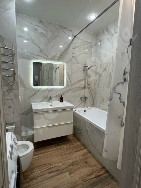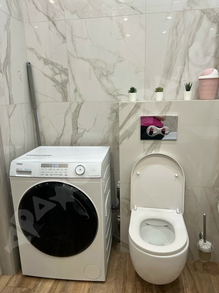 Санузел совмещенный: теплый пол, подвесной унитаз, ванная с душевой системой, стиральная машина, большой шкаф для хранения.