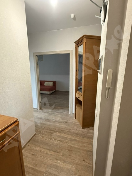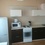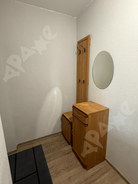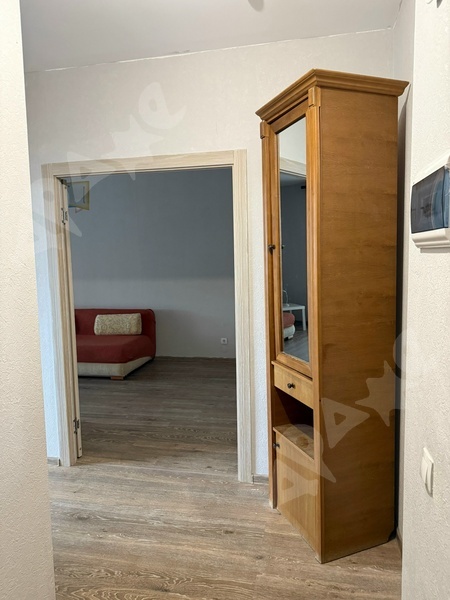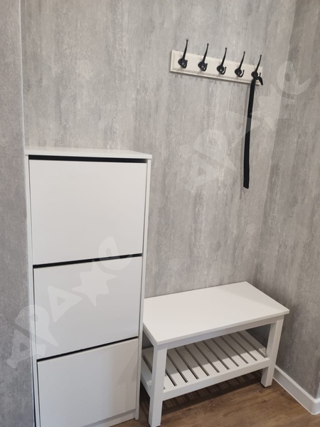 Квартира укомплектована: 2 дивана, кухонный гарнитур, холодильник, кухонный стол с табуретками, индукционная плита на одну конфорку, стиральная машина, сушилка для белья, большой шкаф в комнате, шкаф с вешалками в прихожей, стеллаж. В квартире никто не жил.