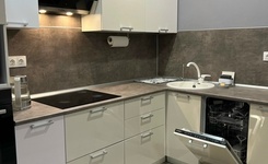 - Современная кухня со встроенными посудомоечной машиной, духовкой, варочной панелью с 2 быстроразогревающимеся конфорками, фильтрами для питьевой воды с выводом на смеситель раковины;